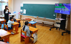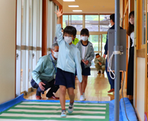 1年生は、説明のDVDを見た後、校内に設置した横断歩道を使って、渡り方の練習をしました。