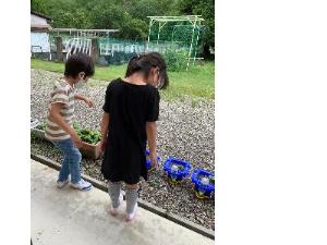 だいこんの間引き菜やきゅうりを収穫しました。「やった~!」と,にこにこ えがお♪