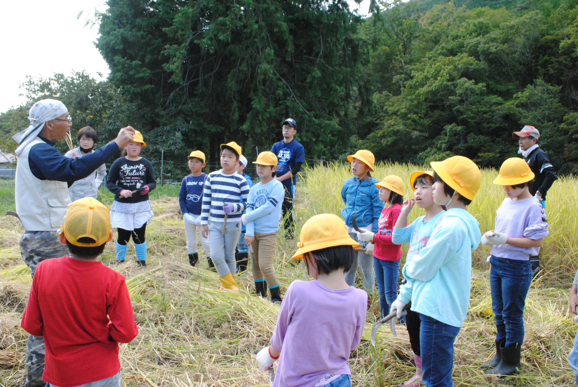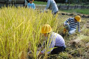 10月6日に2年生から4年生で稲刈りをしました。今年はたくさんの稲穂がついていて豊作でした。さすが、去年経験しただけあり、カマでの収穫作業も早くすることができました。