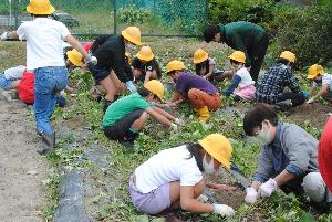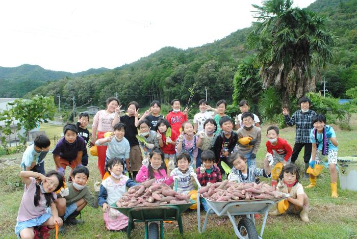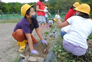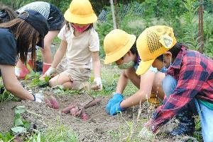 恒例のサツマイモ堀り。5年生は自然学校のため、前日に実施しました。みんな夢中で掘りました!!