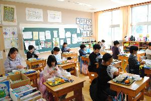 この日の給食は防災給食でした。ナイロン袋を使って作るおにぎりと豚汁とみかんをいただきました。