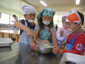 1年生といっしょに、ヨモギのホットケーキ作り。