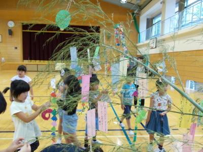 この日までに、クラスや家で作ってきた七夕飾りを、願いを込めて竹に結びつけました。願い事がかないますように。