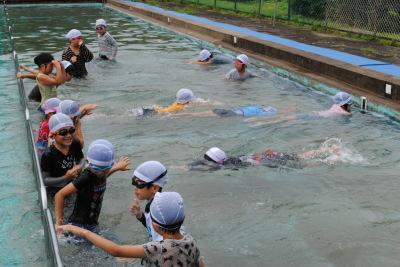 7月12日に着衣水泳がありました。1・2年生は服を着て泳ぐ感覚を体験しました。水着と違って、服が重くて泳ぎにくかったですが、プールサイドを岸に見立てて、そこまで一人で泳ぎ切る練習をしました。