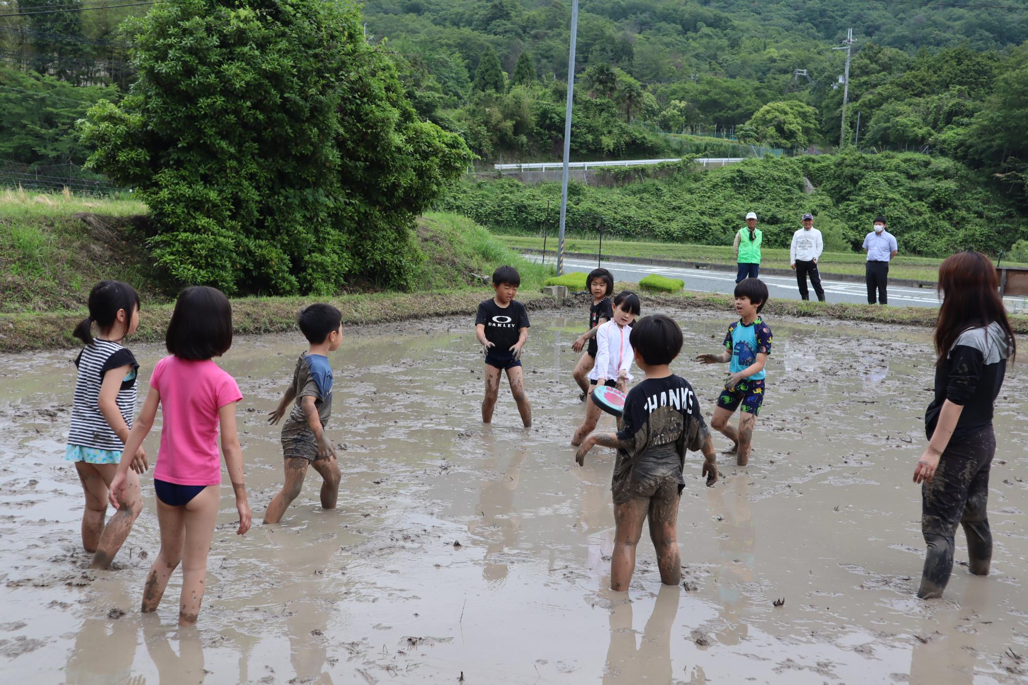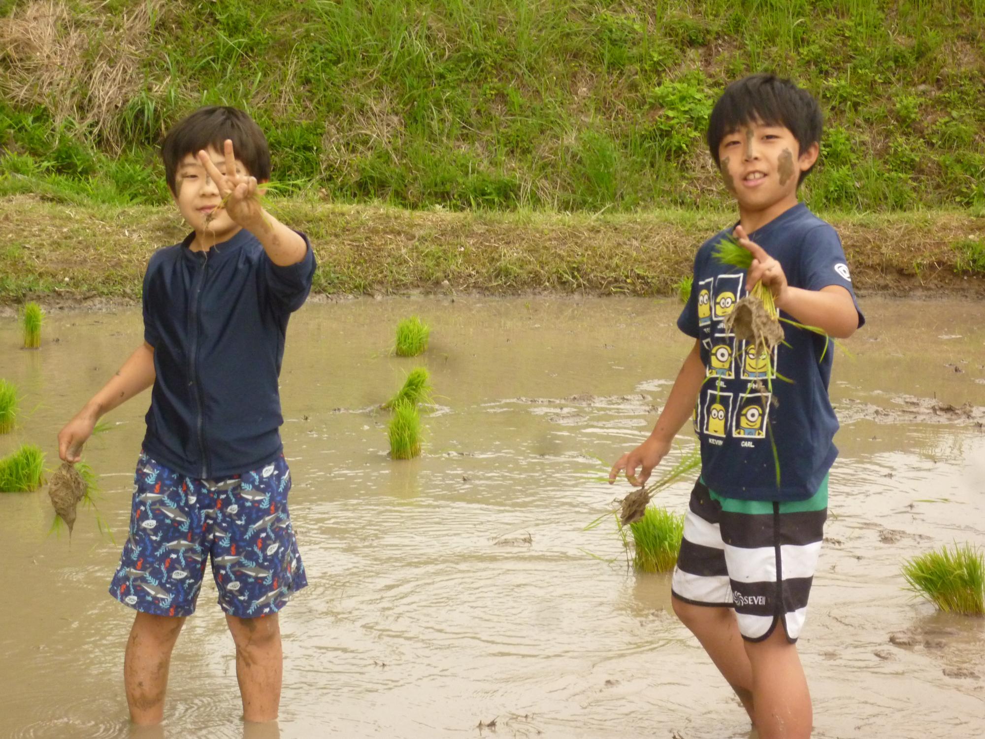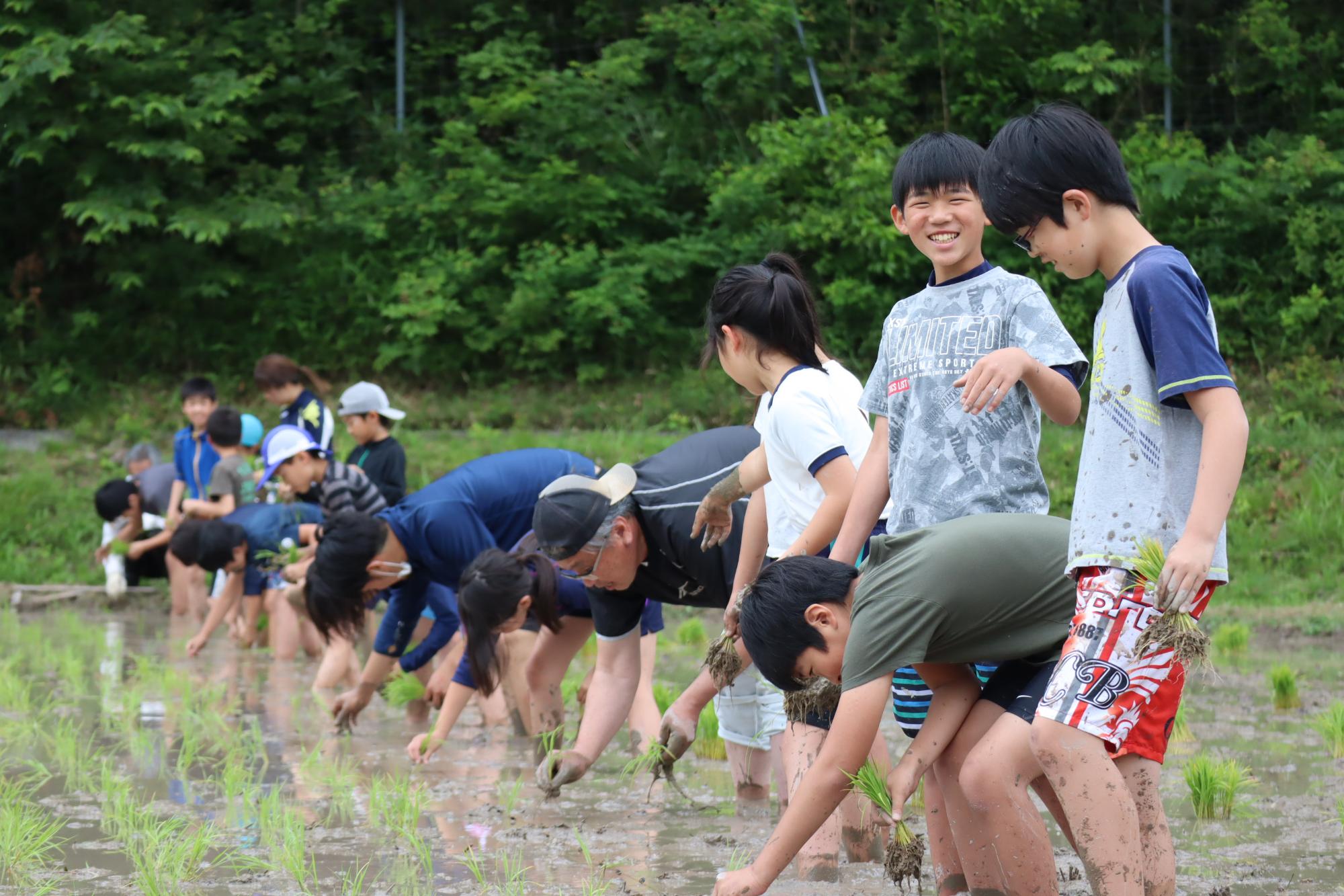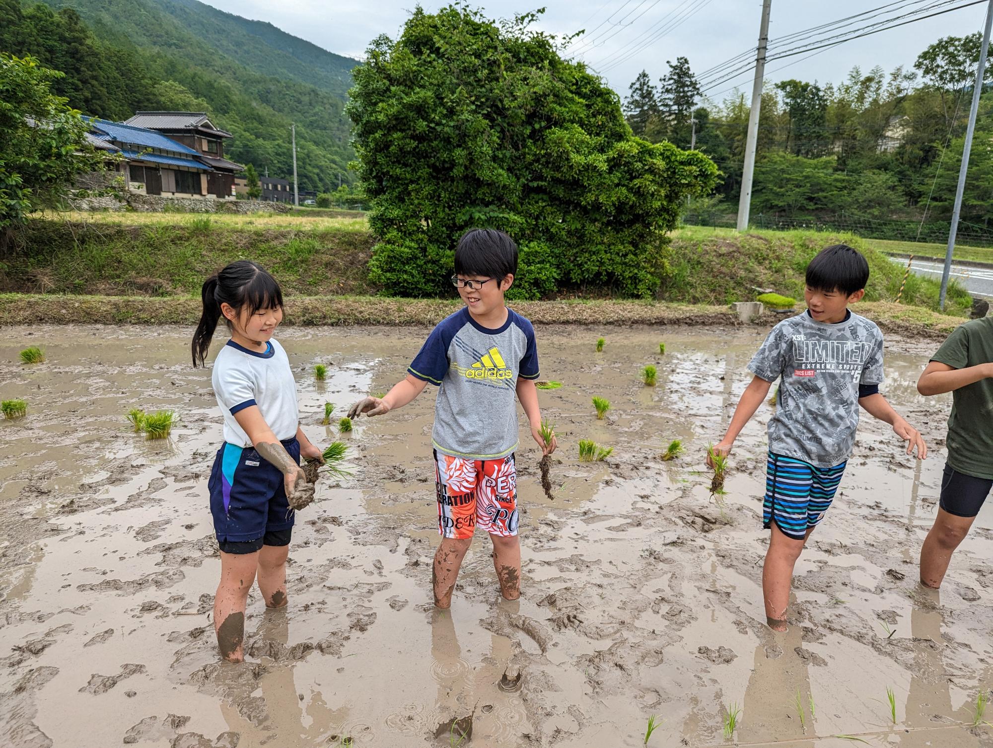 途中で、泥を付け合ったり、お尻をつけたり…。楽しみながら、おいしいお米が育つように心を込めて、苗を植えていきました。