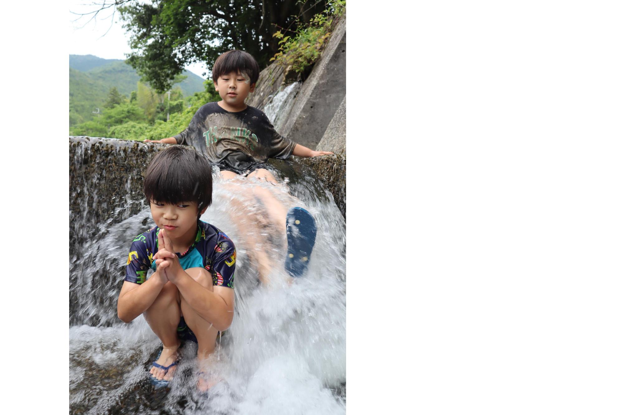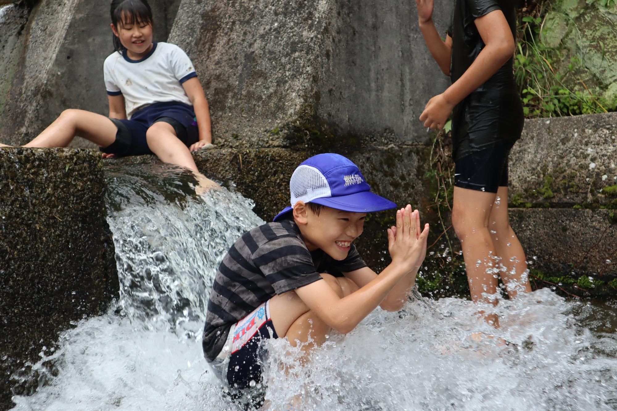 田植えの後は、汚れた体を川で洗い流しました。「キャー、冷たい!」「楽しい!」など大きな歓声が響き渡りました。