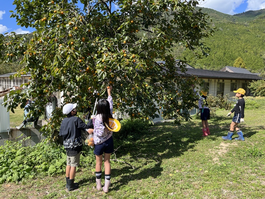 里山には柿が鈴なり。3・4年生は干し柿づくりに挑戦中。