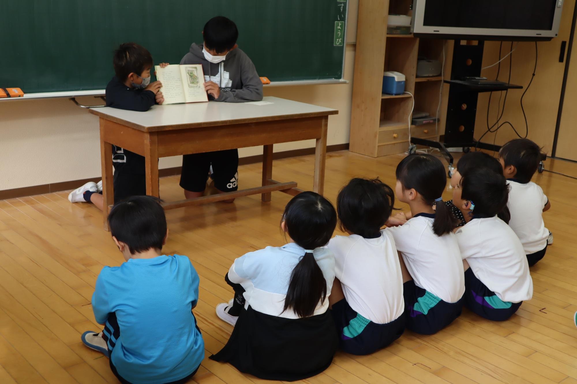 図書委員会が中心になって読み聞かせをしています。みな読み聞かせをしてもらうのが大好きです。