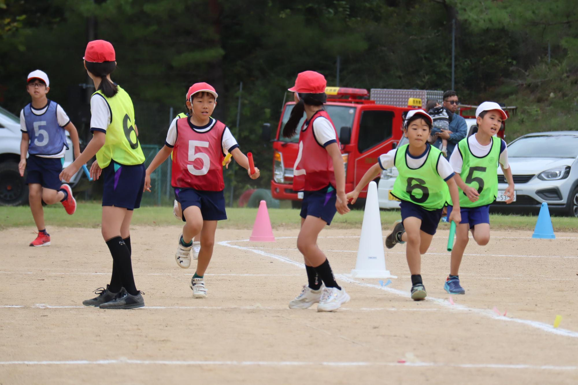 1年生から6年生までの全校リレー。バトンパスの練習を何度もし、本番ではずいぶん上手になり、白熱した戦いとなりました。