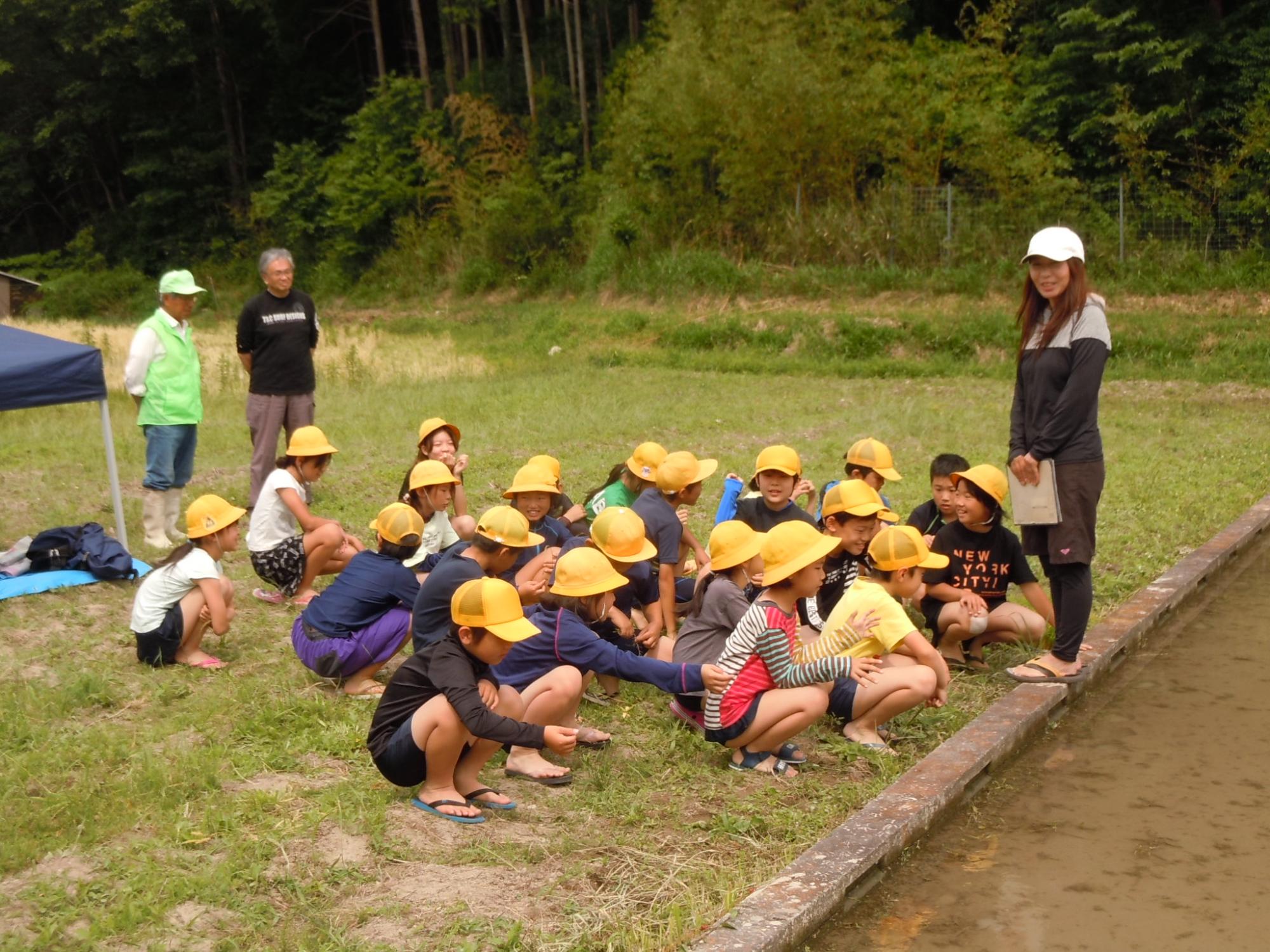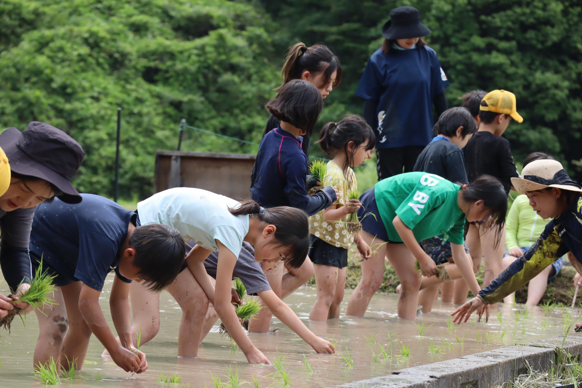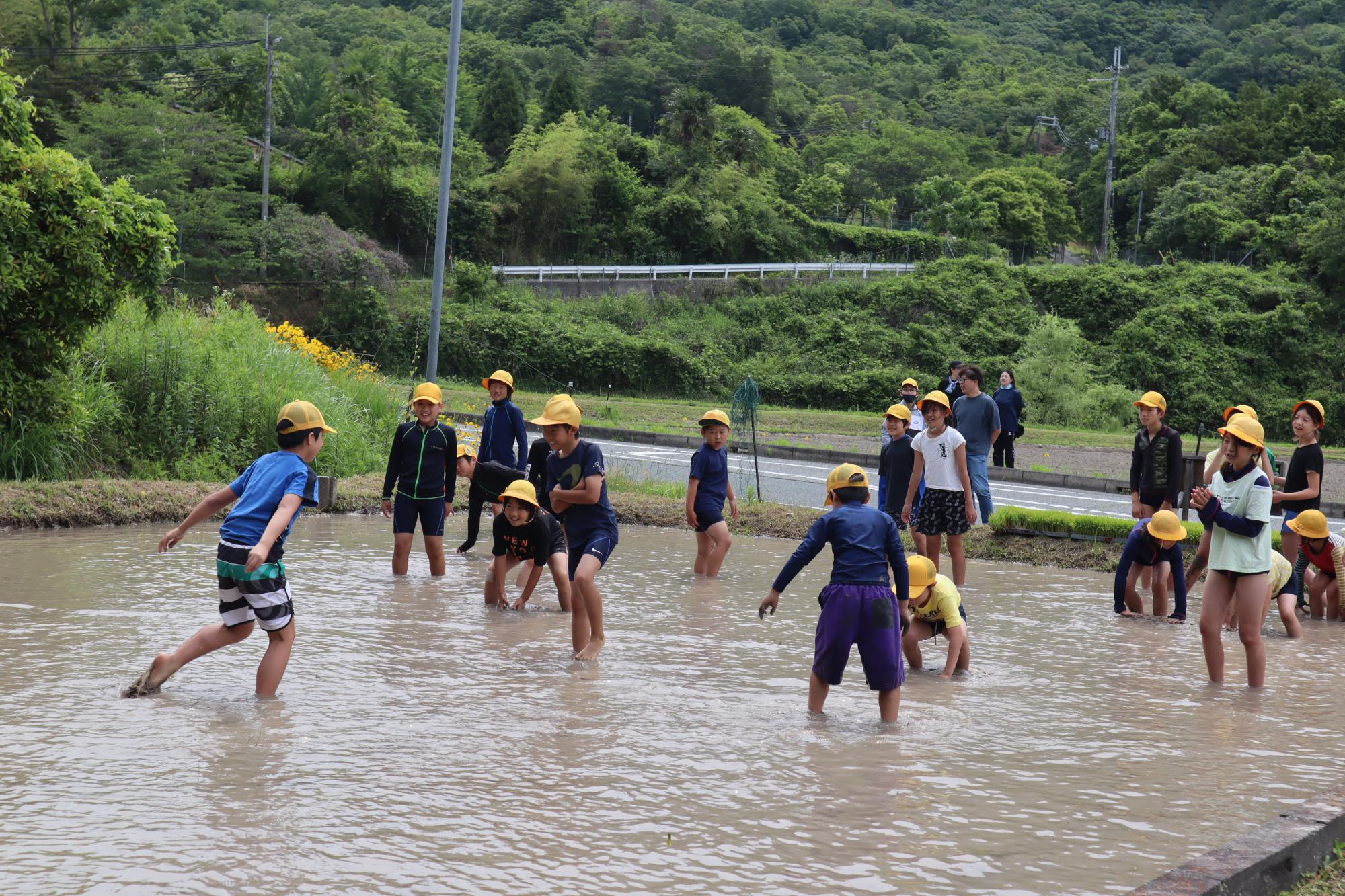 「田植えの先輩」である5・6年生が、1~4年生にレクチャーする形で田植えをしました。