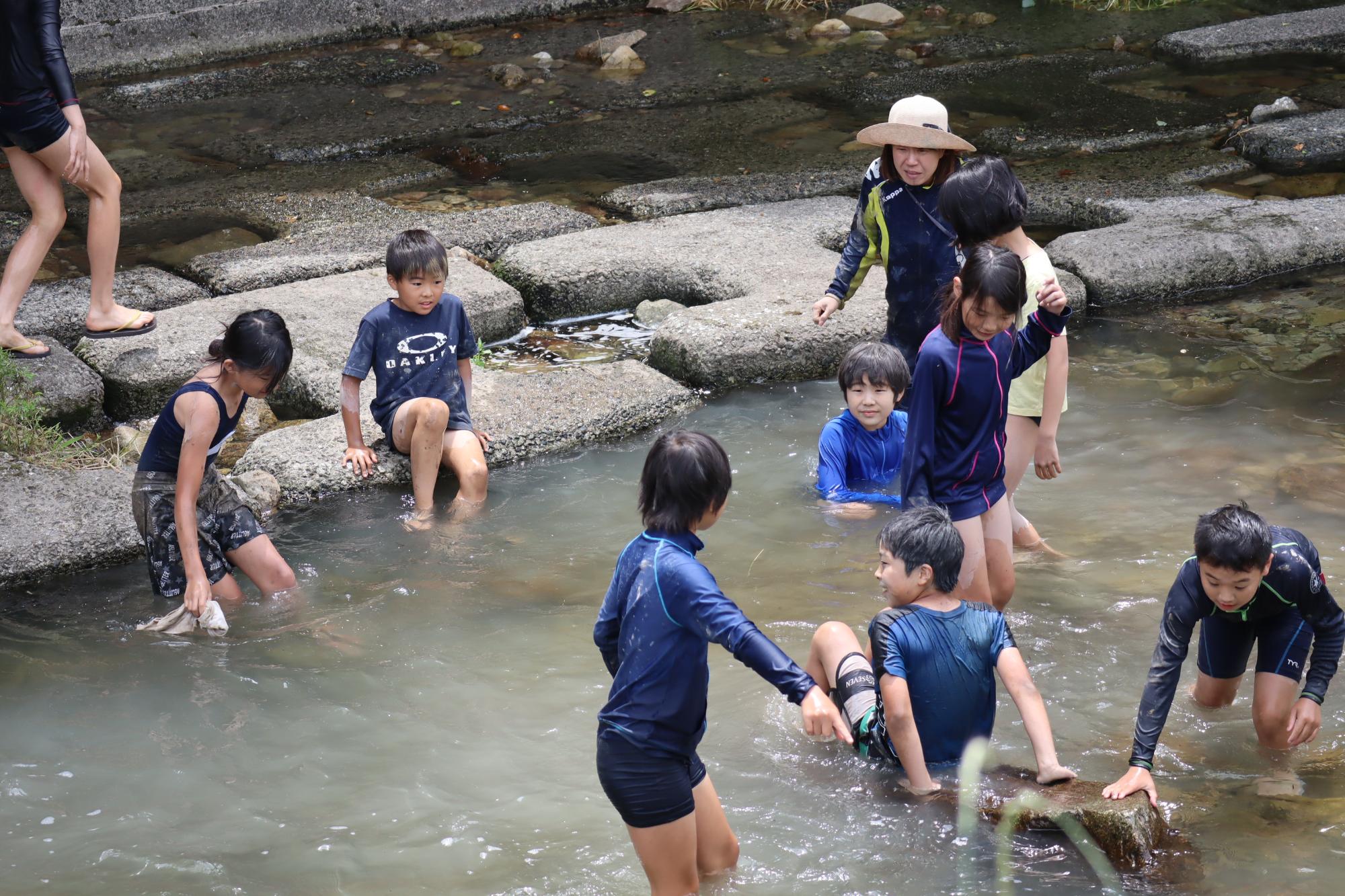 田植えの後は、汚れた体を川で洗い流しました。「冷たい!」「気持ちいい!」など大きな歓声が響き渡りました。