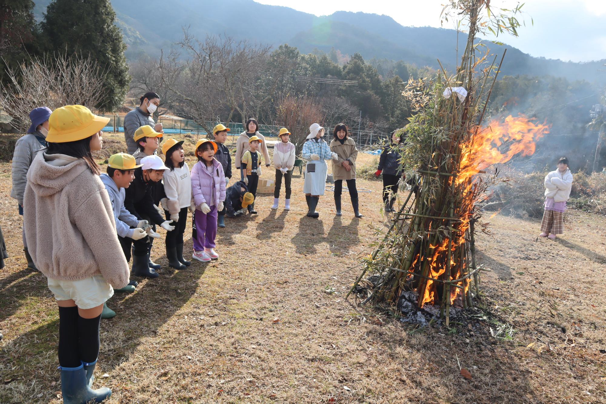 1月21日にとんどを行いました。竹の破裂音が鳴り響くたびに、「びっくりした!」「すごい!」などの声が上がりました。