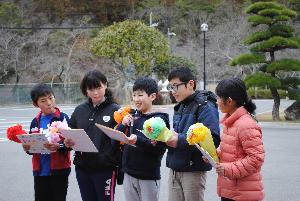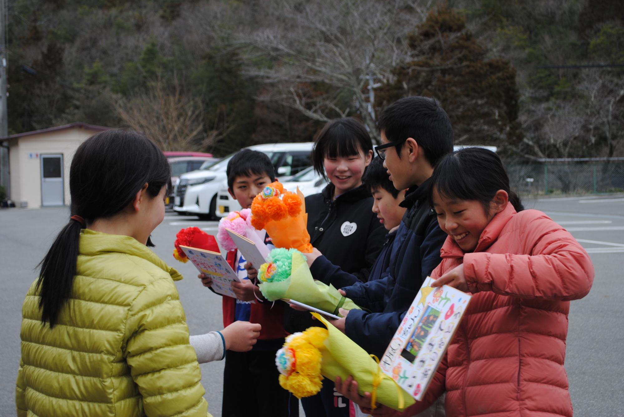 西光寺山を下山した後、今までお世話になった6年生に、全校生からの色紙と花束を渡しました。