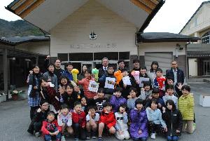 今日最後の集合写真。6年生を真ん中に校舎をバックに撮りました。6年生も喜んでくれてよかったです。