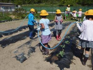 「みんなでホースを持ったらどうかな?」と、自分たちで考えたやり方です。楽しそうです。