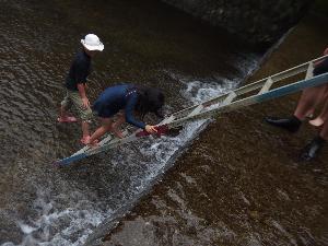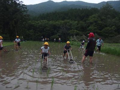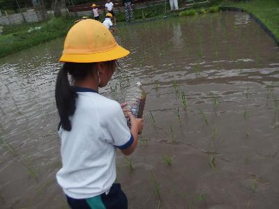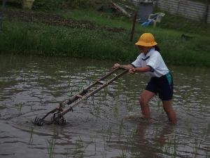 田の草取りをしました。いねの成長をさまたげる雑草を取り除く作業です。草取り機の説明を聞き、取りかかりました。慣れるまではなかなか前へ進めなかったけれど、だんだんコツをつかんで、しっかり草取り機を動かすことができました。おいしいお米に育ってくれますようにと願いを込めて、がんばりました。