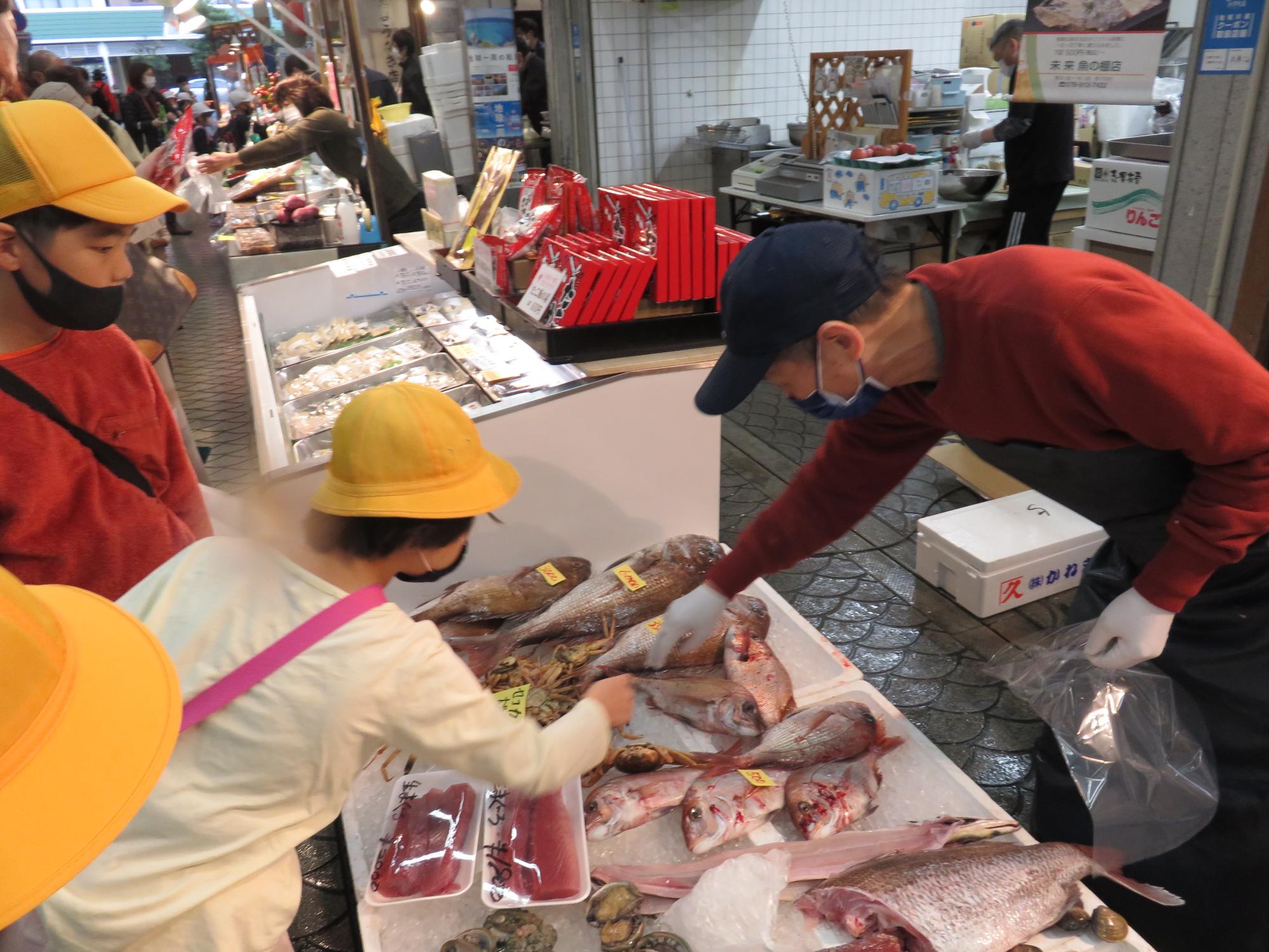 おいしそうな魚がいっぱいでした。持っているお金で買えるかな。お財布と相談です。