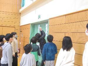 体育館中にかくされたカードを縦割り班(4つ)で探し出し、最後には4グループあわせて1つのメッセージをつくりました。