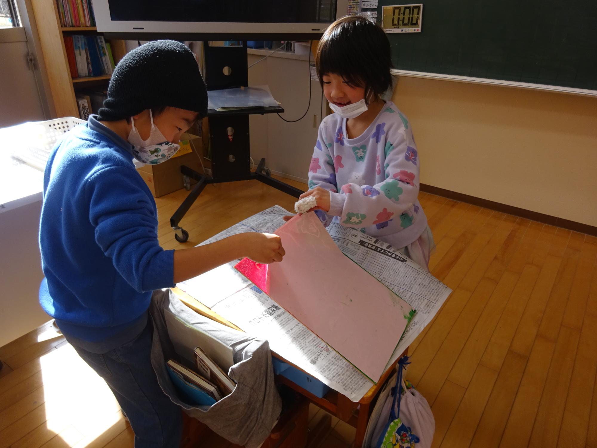 二人で協力して、紙を慎重にめくっています。