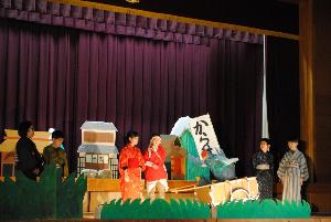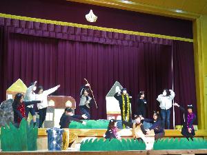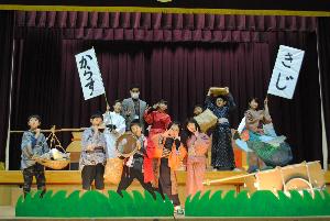 3・4年生は「吉四六さんの人助け」です。町人の困りごとを吉四六さんが得意のとんちで解決していく様子をおもしろおかしく演じられました。
