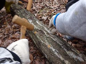 ドリルで穴を開けた所に、菌を入れて木槌でトントン打ち付けていきます。