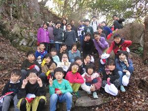 途中の休憩ポイントのこぐり岩に到着。全員揃ったので恒例の集合写真。低学年はここで遊んでから、学校へと下山しました。