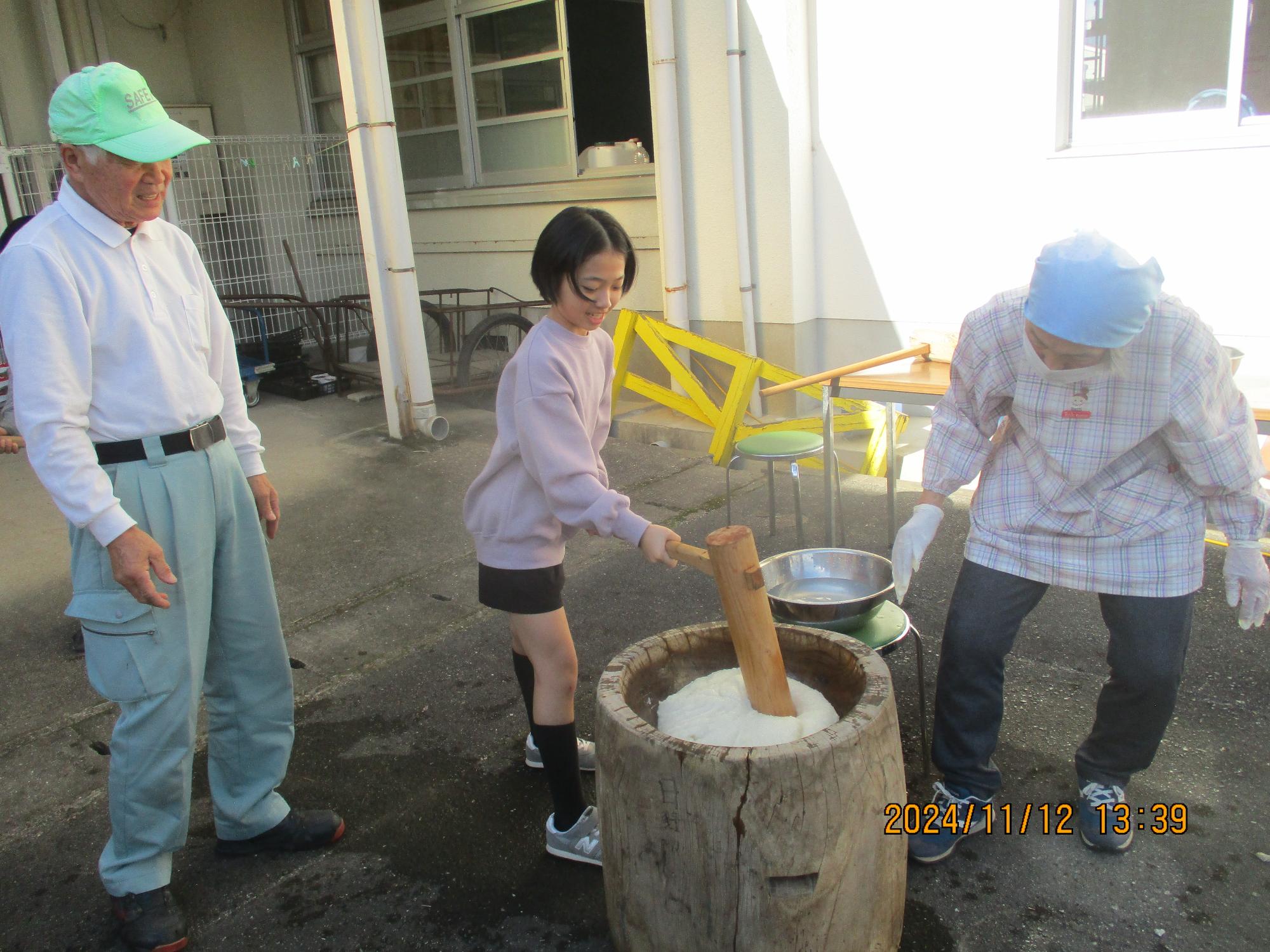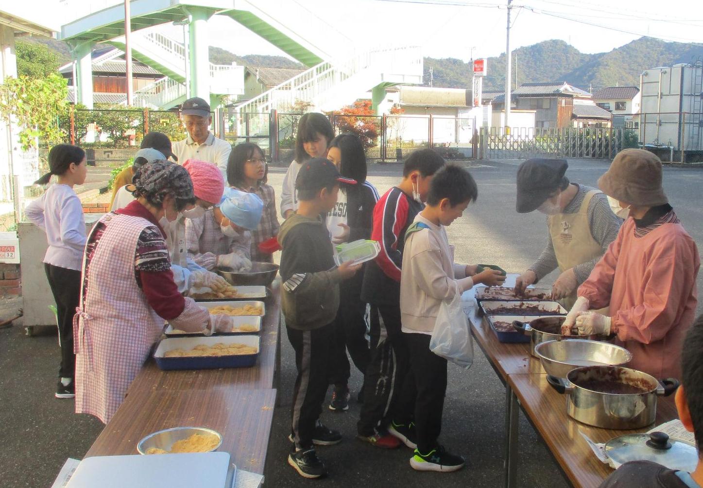 11月には地域の方と共に収穫祭を行いました。自分たちで収穫した餅米をふかして本格的な餅つきを経験しました。臼と杵を初めて見る子も多く、実際に杵を持つことでその重さに驚いていました。つきたてのお餅は、地域の方お手製のあんこときなこでおいしくいただきました。日野小学校ならではの貴重な体験をさせてもらい、食べ物にも作り手にも教えてくださった地域の方にも感謝した1日でした。