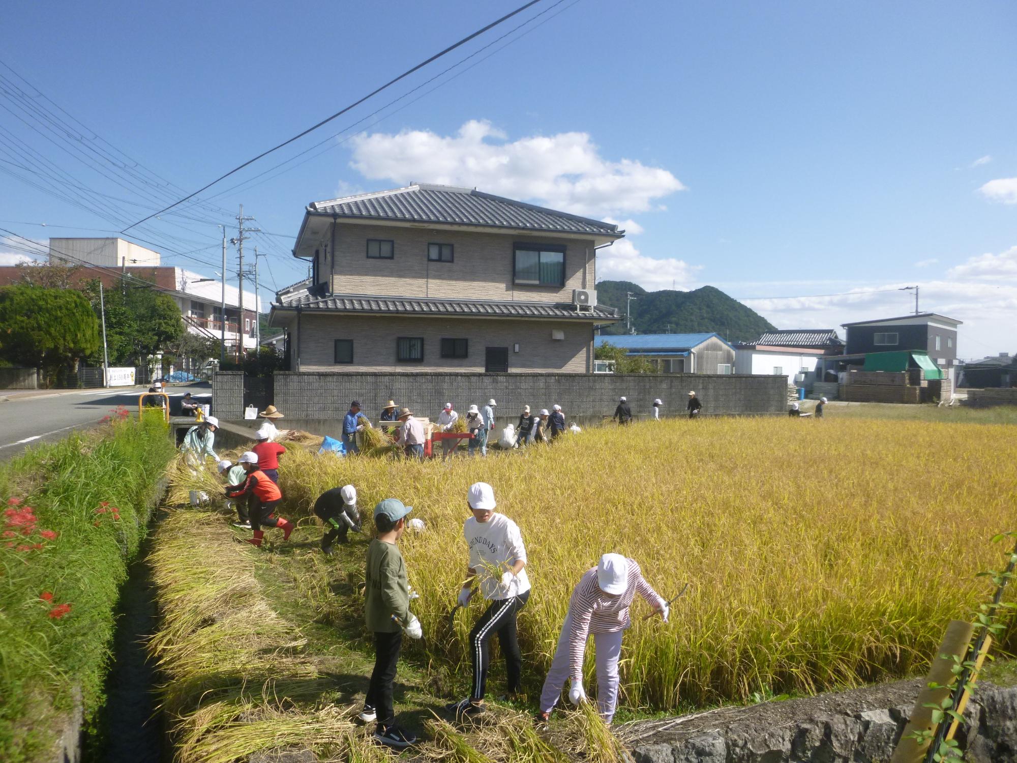 1学期に総合的な学習の時間に地域の方に協力していただき、田植えを行いました。そして、10月。黄金色の稲穂がたわわに実り、収穫の時を迎えました。鎌を持って手作業で稲を刈っていきます。慣れない道具や作業に最初こそ苦労していましたが、コツを掴んだ子どもたちはすぐに慣れていきました。