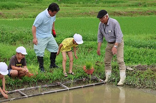6月23日に1年生から3年生までの児童が、地域の方やJAの方のお世話になり、田植えを行いました。初めは泥にとまどっていた子どもたちも次第に苗を植えるのが速くなっていました。