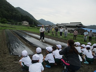 6月12日に1年生から3年生までの児童が、地域の方やJAの方のお世話になり、さつまいものつる挿しを行いました。説明を聞いてから一本一本植えました。秋には大きなお芋ができるといいですね。