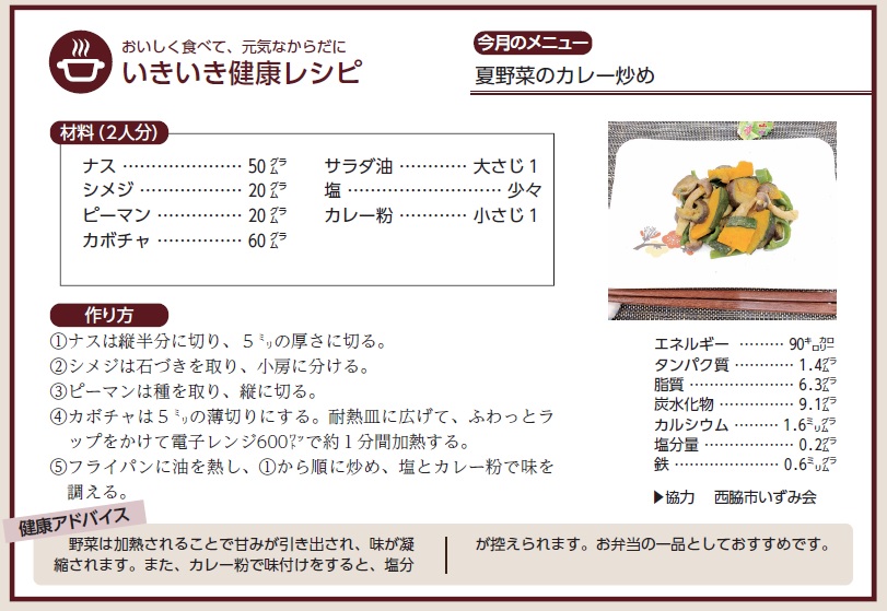 西脇市いずみ会は、高血圧症等の生活習慣病やフレイルを予防するための献立を啓発しています。