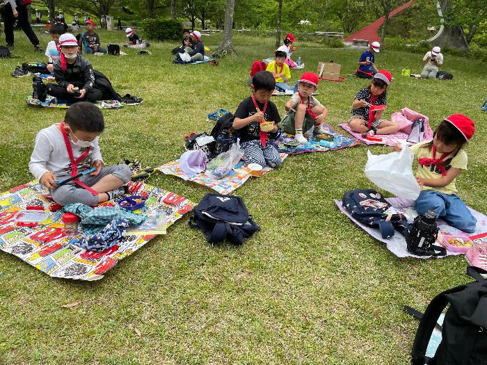 たくさん遊んでおなかペコペコ!いつもなら、みんなで一緒に食べていたお弁当の時間は、友だちと距離をとり、感染症対策を行いながら食べました。お家の方が作ってくれたお弁当の中身を「先生、見て!」と、みんな自慢げに見せてくれながら、おいしそうに食べていました。