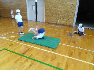 5月の体育では、走り高跳びとマット運動を行っています。