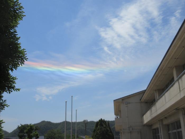 5月14日 お昼に外に出てみるとにじが出ていました。雨のふったあとではないのに、にじは出るのでしょうか。よく見ると雲がにじのように七色に光っていました。調べてみると、この雲は「彩雲(さいうん)」というそうです。見つけると縁起がいいそうです。みんなは見たことがありますか。