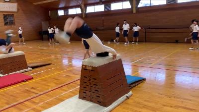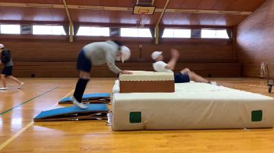 はじめは、跳び箱の上で前転することを不安に感じていたようでした。