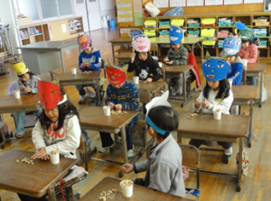鬼は外 更新日:2017年05月02日 節分といえば豆まき。思い思いのお面を作り、豆まきをしました。「すぐ泣く鬼」「いろいろとさぼりたくなる鬼」「あきらめてしまう鬼」などと、追い出したい鬼は様々ですが、楽しく豆まきをしました。豆まきの後は、お食事タイム。赤鬼さんも青鬼さんも黄鬼さんも緑鬼さんも、みんななかよく落花生の殻をむいて豆をいただきました。