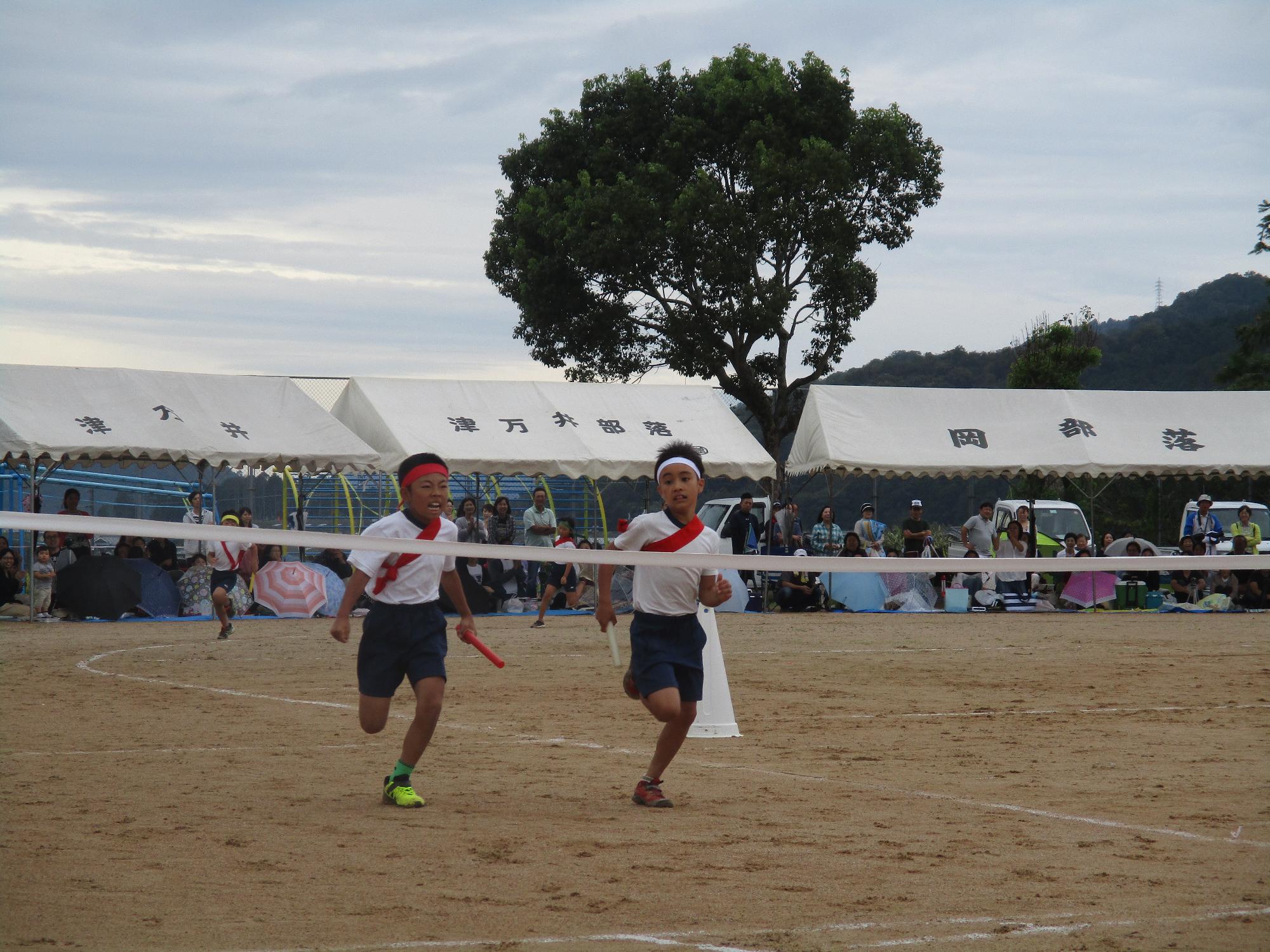 4年生のリレーはアンカー勝負になりました。チームのみんなのためにも、負けられない戦いです。