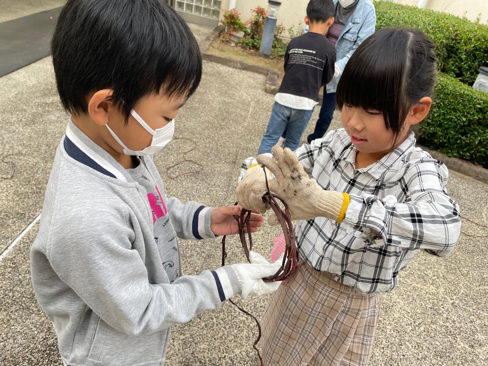 さつまいものつるを使って、クリスマスに向けてのリースづくりをしました。友だちと協力しながら、難しい編み込みもがんばりました。