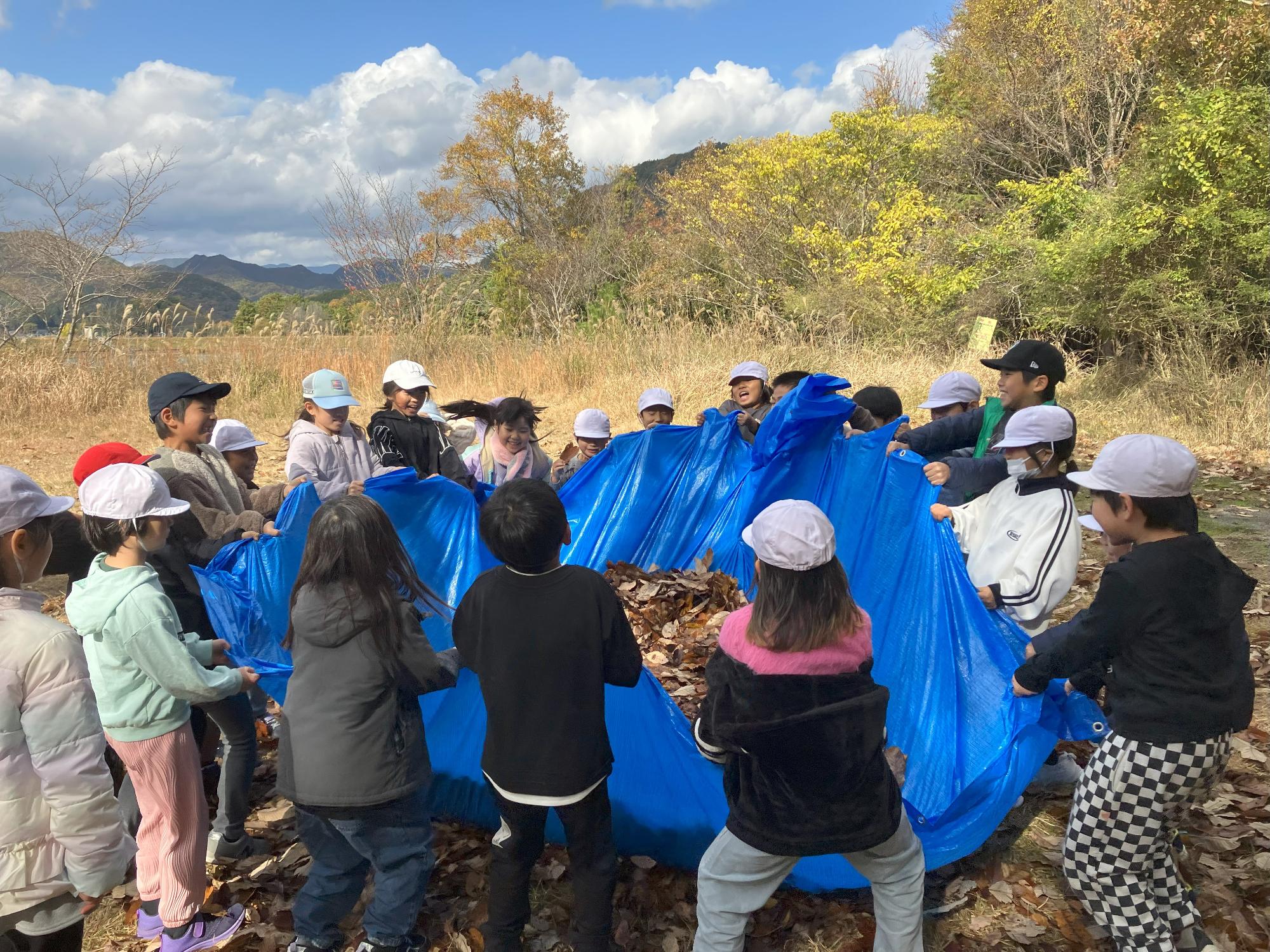11月11日には「みんなで協力!秋の遊びを楽しむぞ」という議題で学級会を開き、11月28日に子どもたちの話し合いで決定した秋の遊びを福谷公園で行いました。この議題には「みんなと協力して遊ぶことで、今よりもっと笑顔を増やし、2年生の秋の思い出をつくりたい。」という提案者の願いが込められており、話し合いの時から「協力」や「笑顔」をキーワードとして考え、話し合う子どもたちの姿が見られました。遊びの中では、落ち葉が濡れていたこともあり、計画通りに遊ぶことはできませんでしたが、子どもたちは落ち葉の上にブルーシートをかぶせるなど知恵を働かせて、全員が笑顔になれるような遊び方を考えることができました。自分たちで話し合い、工夫している姿に成長を感じました。