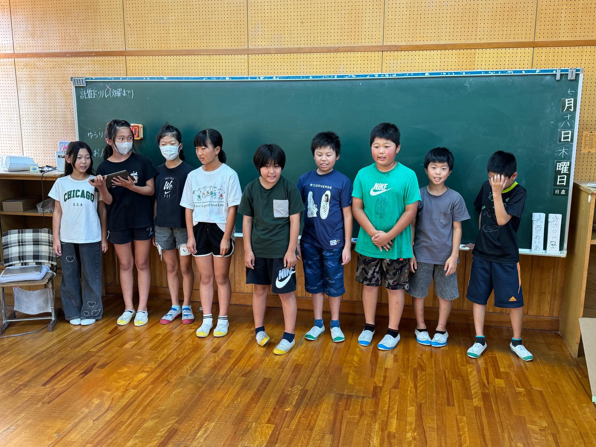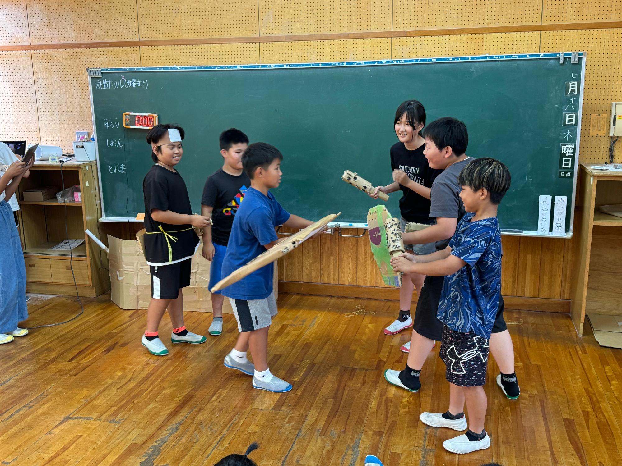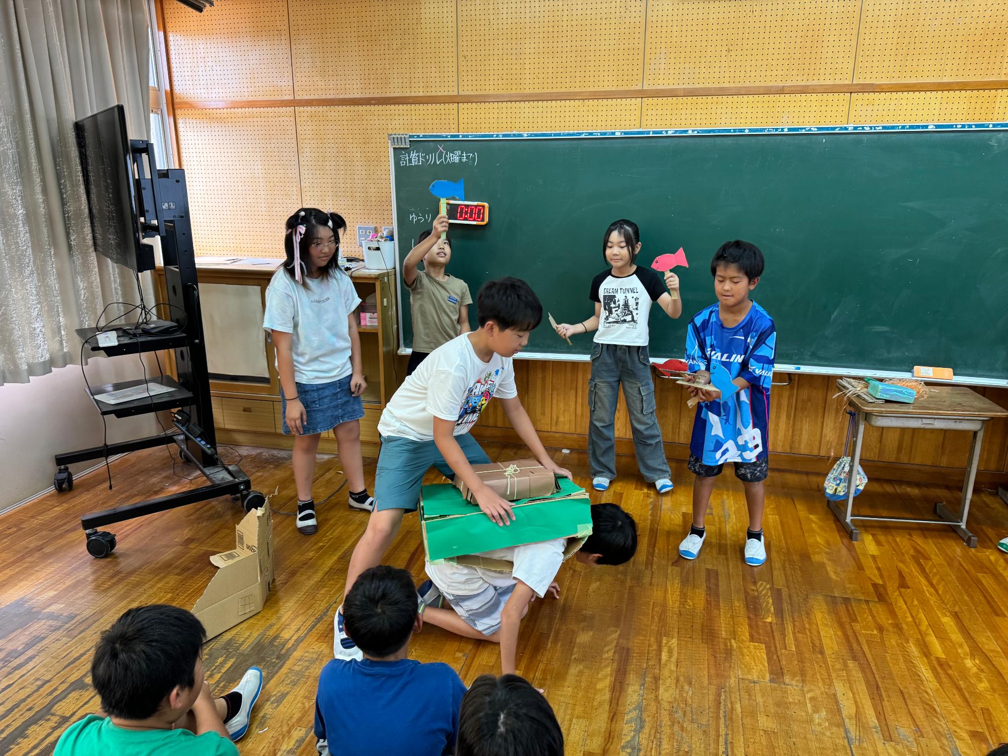 そんな5年生は,1学期の締めくくりの一つとしてお楽しみ会で劇を披露しました。3つのグループに分かれて、「桃太郎」、「浦島太郎」、「3匹の子ぶた」をモチーフにしたオリジナルの劇でした。演技をする方も見ている方もいい表情で,たくましくなった姿を再確認させてもらいました。