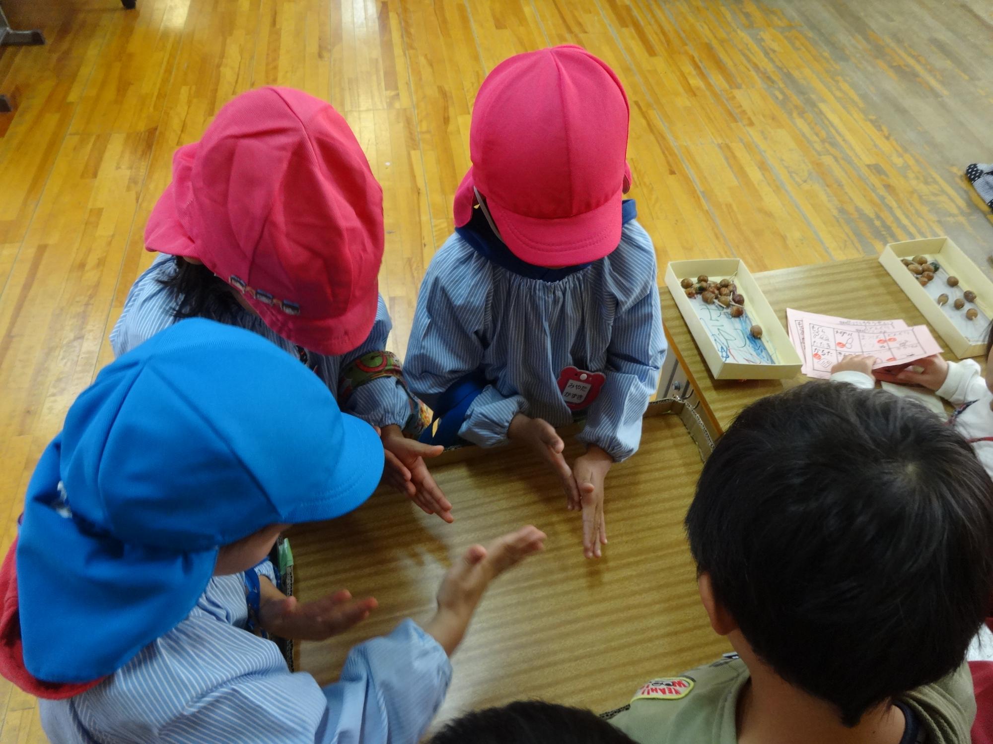 1年生が用意した「おみせやさん」は、「どんぐりごま」「魚つり」「まつぼっくりツリー」「ボーリング」「メダル」「金魚すくい」「もぐらたたき」「かるた」の8店舗。どのお店も工夫をこらし、すてきな「おみせやさん」となりました。