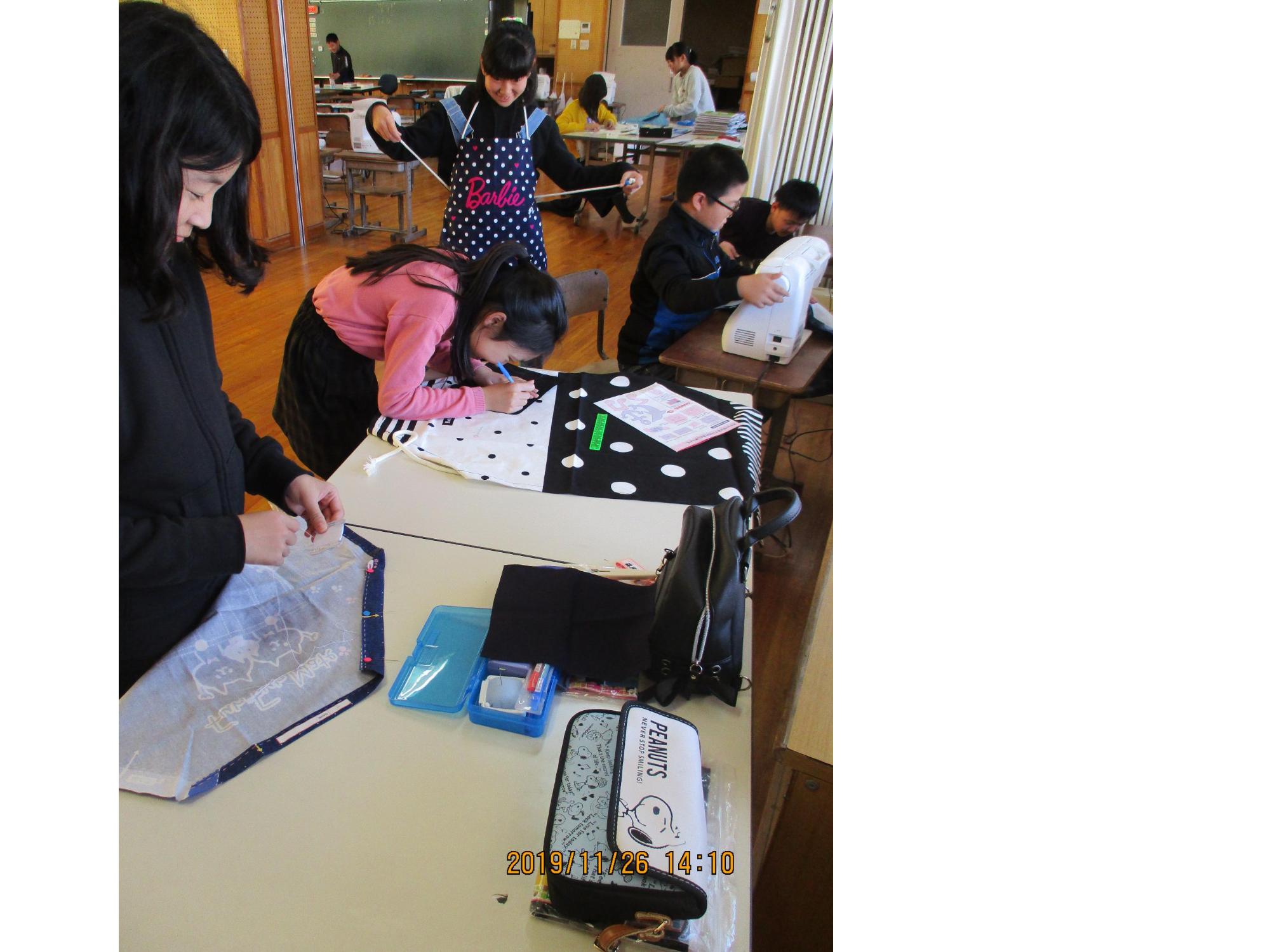 家庭科の「わくわくミシン」では、エプロンづくりを通してミシンの使い方を学んでいます。