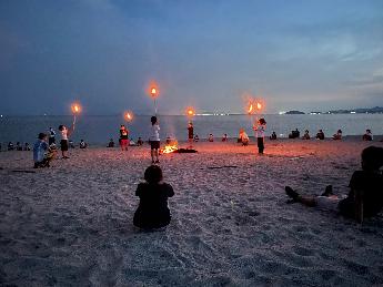 2日目は、カッター研修、砂の造形と浜の散策、キャンプファイヤーとたくさんの体験をしました。カッター研修では、大きな「かい」を二人一組で操り、20人で力を合わせて、カッターをかぎました。見事に、どのカッターも自力で港に帰ってくることができました。浜の散策では、班ごとに波打ち際で遊んだり、「かっぱの涙」とも呼ばれるシーグラスを一生けん命に探したり海の大自然を満喫しました。夜のキャンプファイヤーでは、ゲームでおおいに盛り上がった後、最後の場面では、火を見つめながら、これまで友だちとともに過ごした時間を思い起こしました。