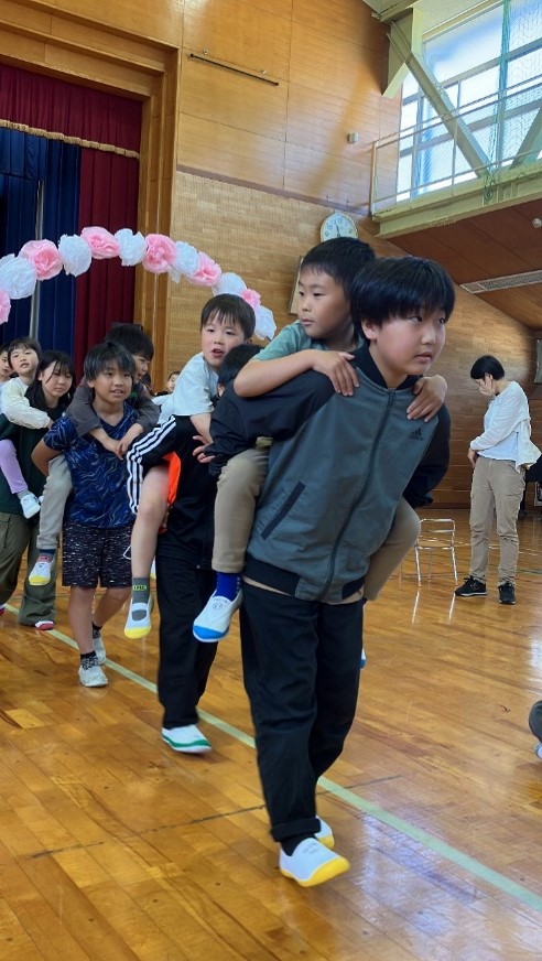 1年生は、6年生のおんぶで、花のアーチをくぐって入場。各学年からの出し物やプレゼントで会を盛り上げ、1年生の入学を全校生でお祝いしました。それぞれの学年が、1年生に喜んだり、楽しんだりしてもらえるように工夫を凝らしました。