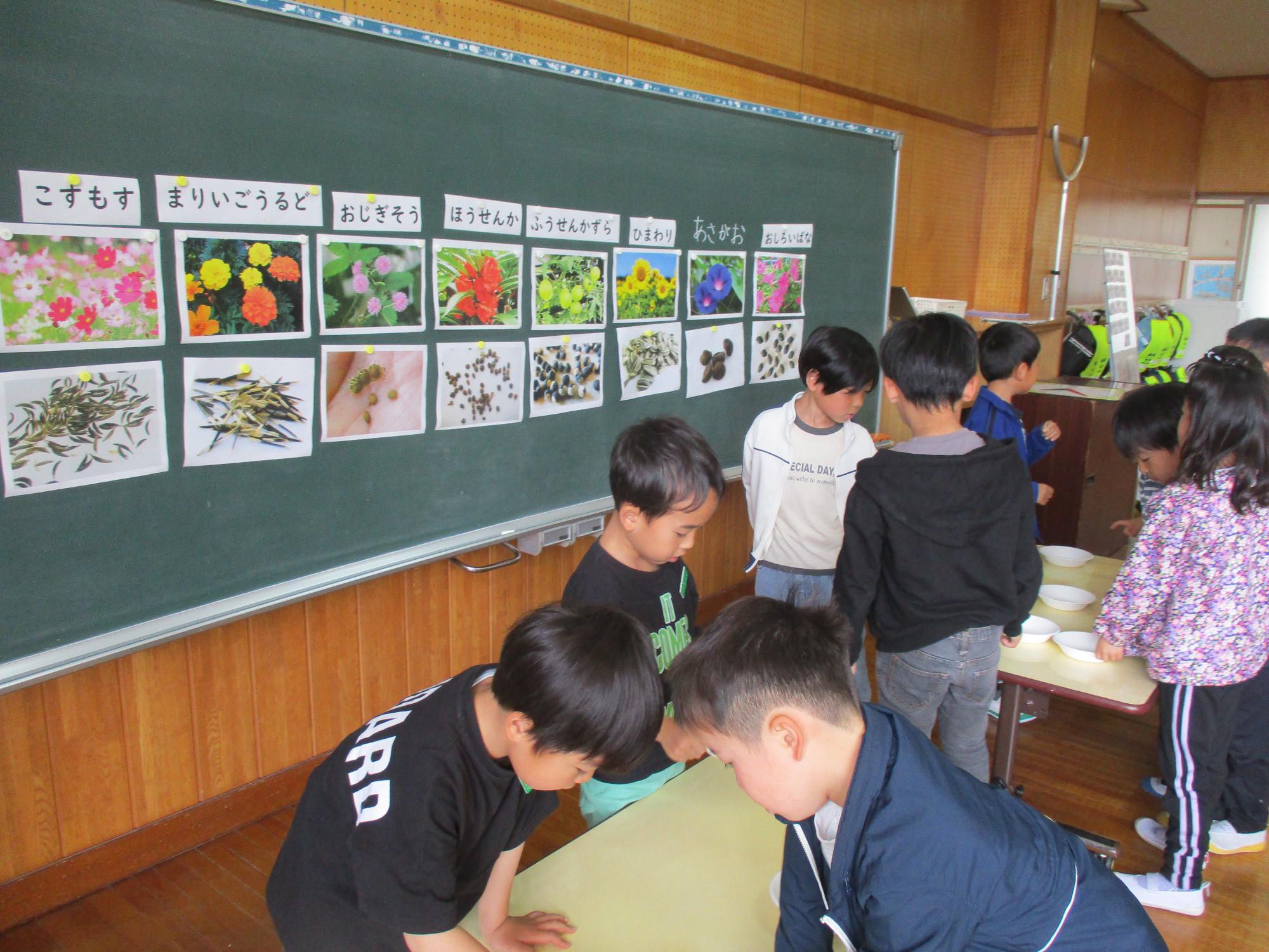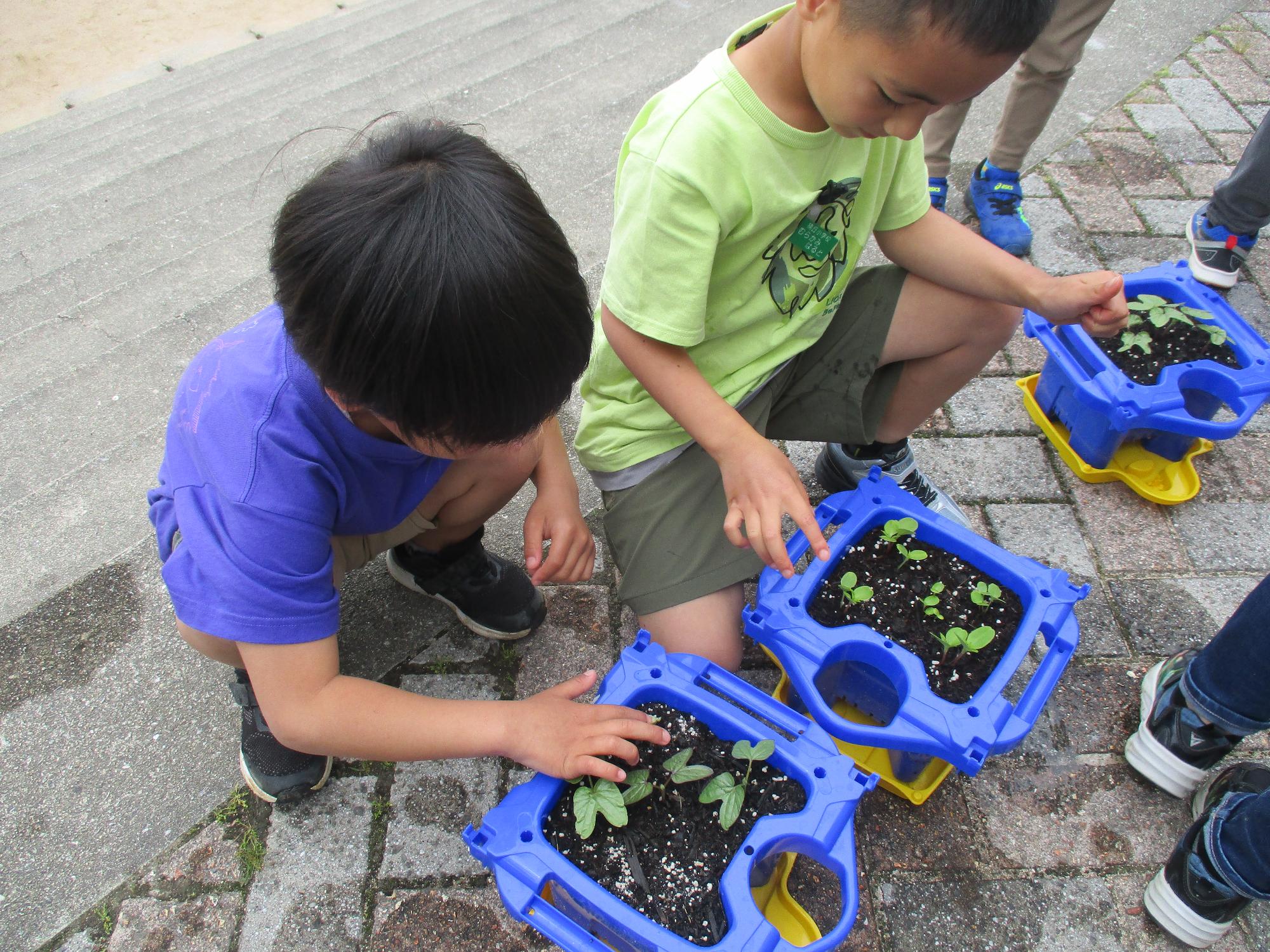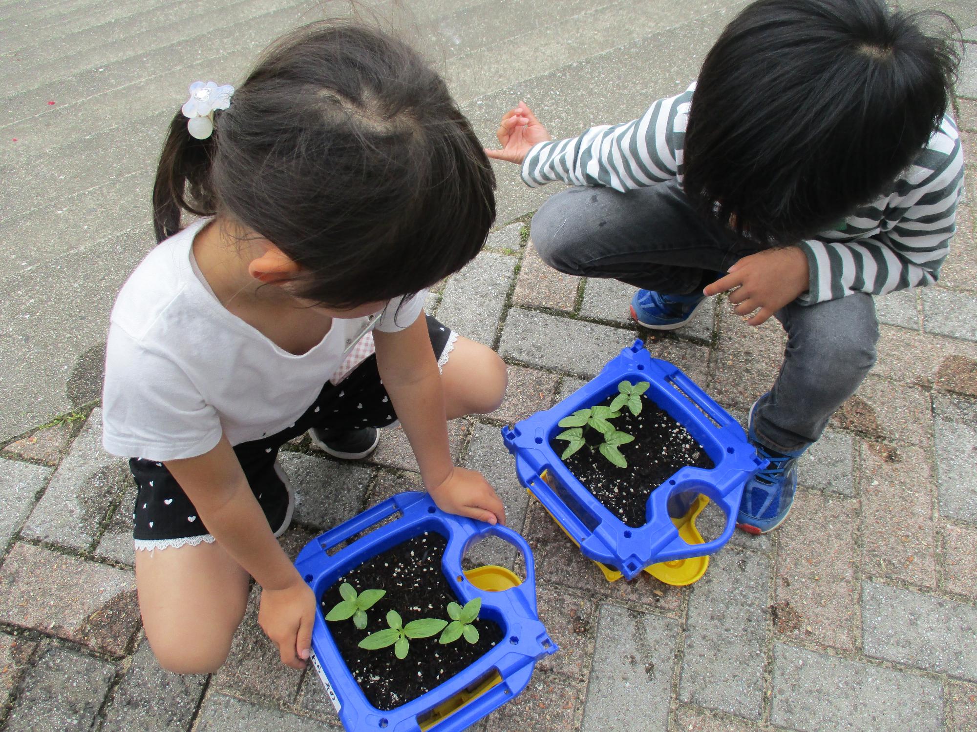 5月、1年生は8種類の中から育てたい花を選び、種をまきました。毎日水をやり、草をひき、すくすくと育っています。日ごと観察していると、たくさんの発見があります。