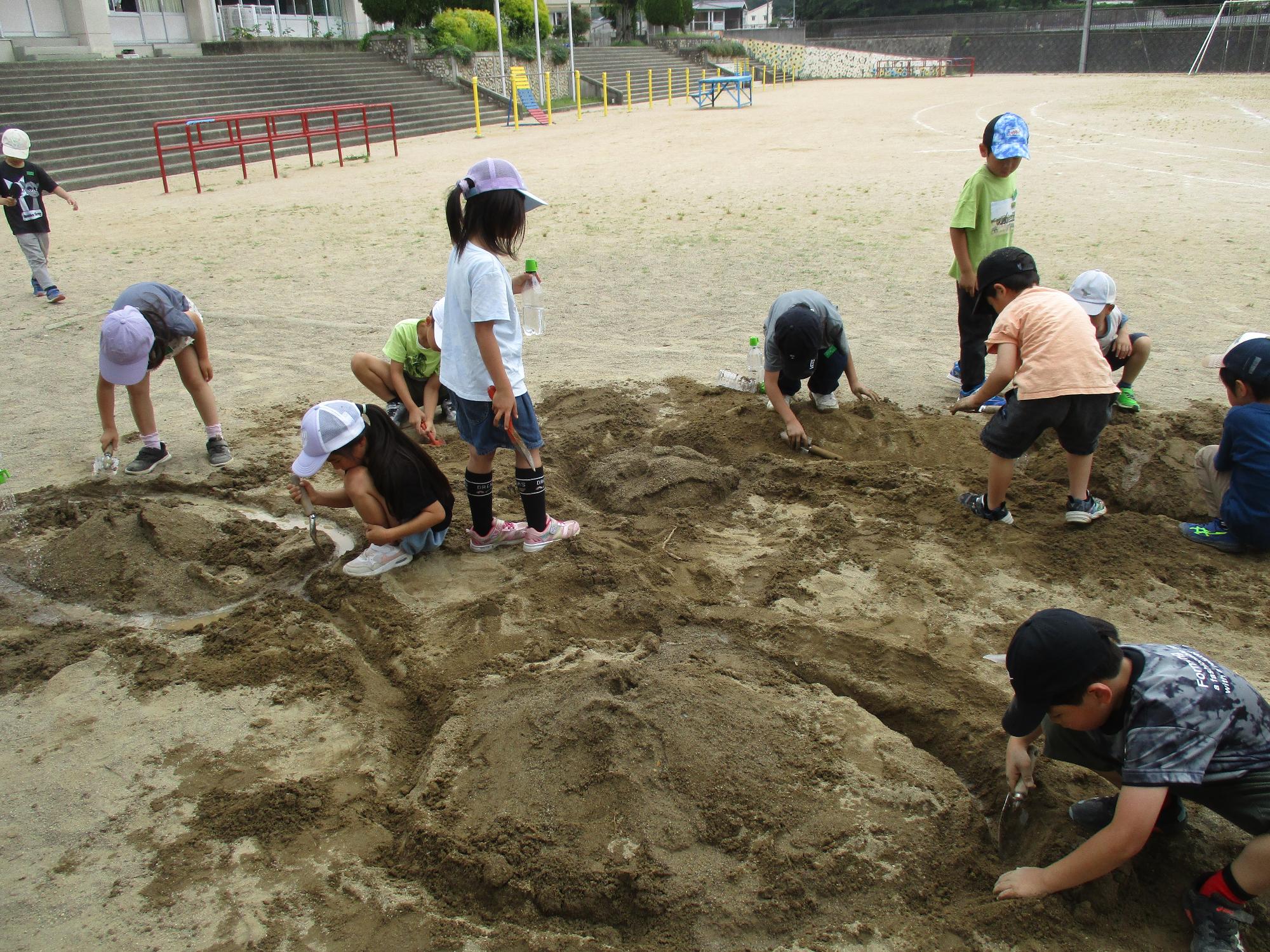 また、図工科と生活科の学習を関連させて、砂・土遊びをしています。遊んでいると、