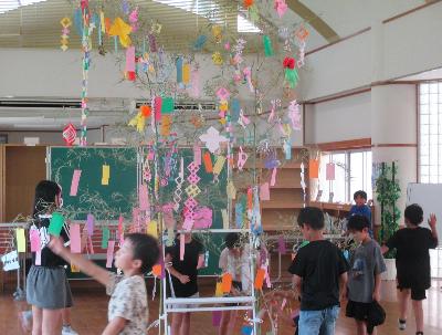 いよいよ、七夕まつりが開催されました。業間休みや昼休みになると、短冊に願い事を書きに子どもたちが集まってきました。「〇〇ができるようになりたい」「みんなが仲良くなれますように」など、たくさんの願い事が飾られていきました。