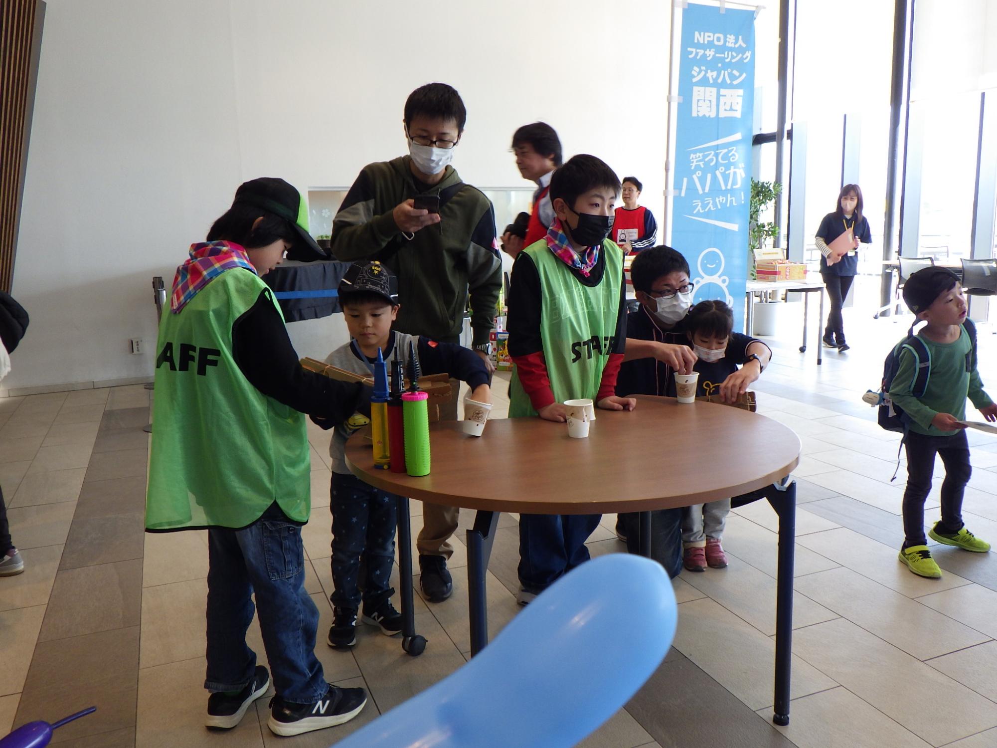 イベント当日は、バルーンアート、ペットボトルキャップシューター、体を使った遊びやテーブルゲームのブース担当に分かれて、ファザーリング・ジャパン関西のお父さんたちと一緒に、参加者に楽しんでもらえるよう頑張りました。