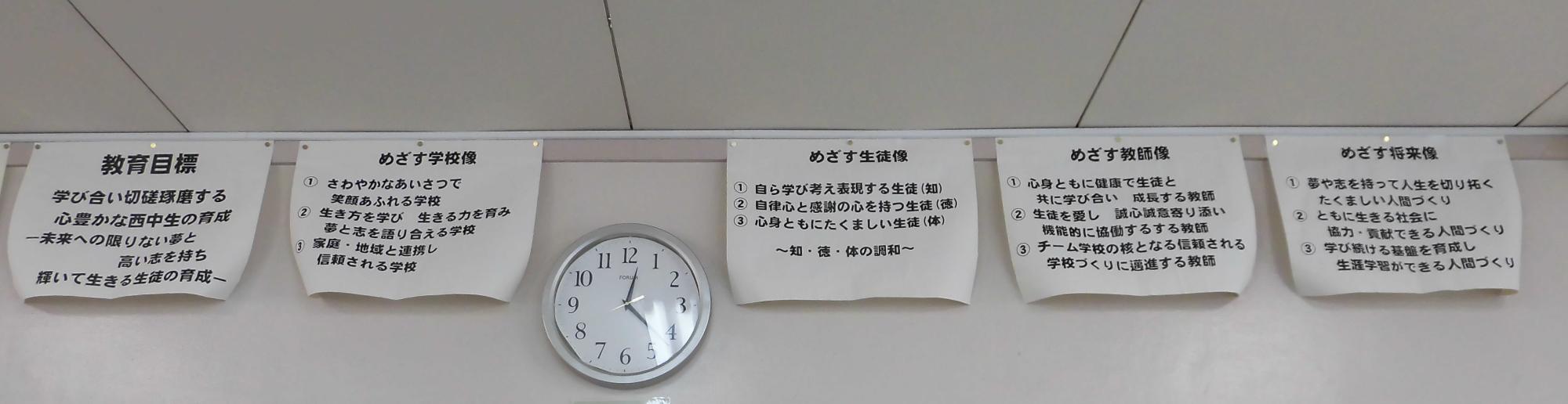 教育方針 更新日:2025年04月08日 校 訓 : 「立志 努力 友情」 教育目標 : 学び合い切磋琢磨する 心豊かな西中生の育成 めざす学校像 : 〇さわやかなあいさつで 笑顔あふれる学校 〇生き方を学び 生きる力を育み 夢と志を語り合える学校 〇家庭・地域と連携し 信頼される学校 めざす生徒像 : 〇「一人が美しい」 〇「ひとりぼっちをつくらない」 〇「ことばの力を磨く」