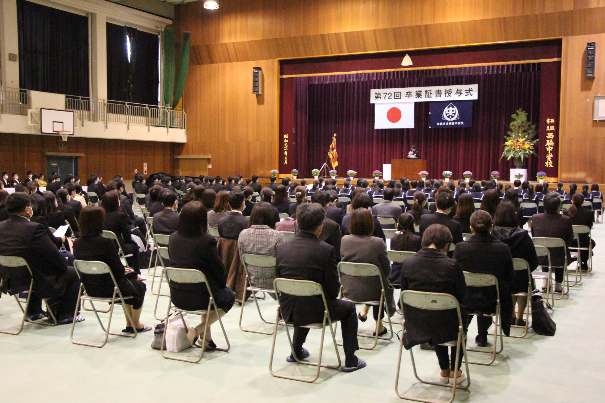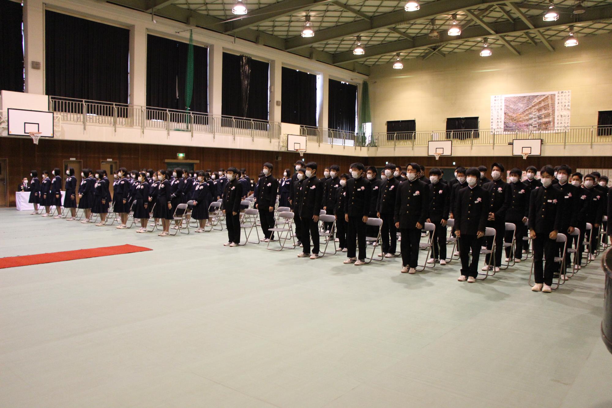 旧生徒会役員に記念品が贈られ、新生徒会へ校旗を渡し、引継式が厳粛に行われました。